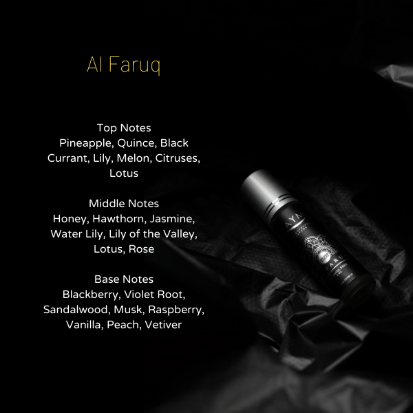 Al Faruq adalah varian terbaru Zaym yang ketika diluncurkan langsung mendapat sambutan baik dari customer loyal. Wanginya segar, lembut dan mewah. Perpaduan wangi buah, tanaman air, aneka bunga dan kayu cendana serta musk menjadikan aroma wangi Al Faruq sangat mudah membangkitkan semangat dan kegembiraan. Wanginya sangat khas dan beda. Type parfum Floral Fruity Musk. Sangat cocok dipakai di pagi dan siang hari. Bukan hanya untuk ibadah, tetapi juga sangat cocok untuk dipakai ke kantor, ke acara dan aktvitas lainnya. Al Faruq adalah salah satu varian Zaym yang dalam waktu singkat sudah langsung digemari.